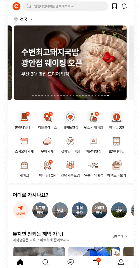 A: 매장 상세 페이지의 '웨이팅 신청' 버튼으로 등록 가능합니다. 위치 기반 서비스 동의가 필요합니다.