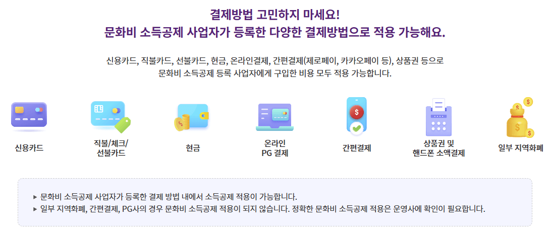 동 제도는 조세특례제한법 제126조의 2 (신용카드 등 사용금액에 대한 소득공제)에 따라 ‘근로소득자가 법인 또는 사업소득이 있는 개인사업자로부터 재화나 용역을 제공받은 경우’에 소득공제 적용대상임. 따라서 현행 조세특례제한법상 문화비 소득공제 사업자가 아닌 자로부터 도서, 공연티켓, 박물관·미술관 입장권 및 신문(종이), 영화표를 구매(개인 간 거래 포함)한 신용카드 등 사용금액은 소득공제 적용되지 않음.